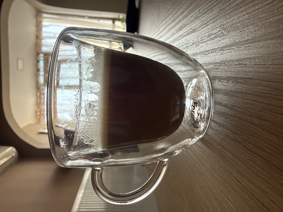 - "A clear, double-walled glass mug, displaying "Luigi Ferrero" branding on its base, rests on a light brown wood-grain surface" by FM-bxxEV2, licensed under CC BY 4.0