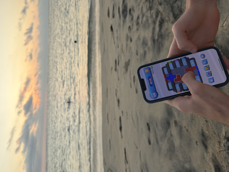 - "At a beach, someone holds an iPhone displaying a game with colorful blocks, engaging with their finger" by FM-TOA2r1, licensed under CC BY 4.0