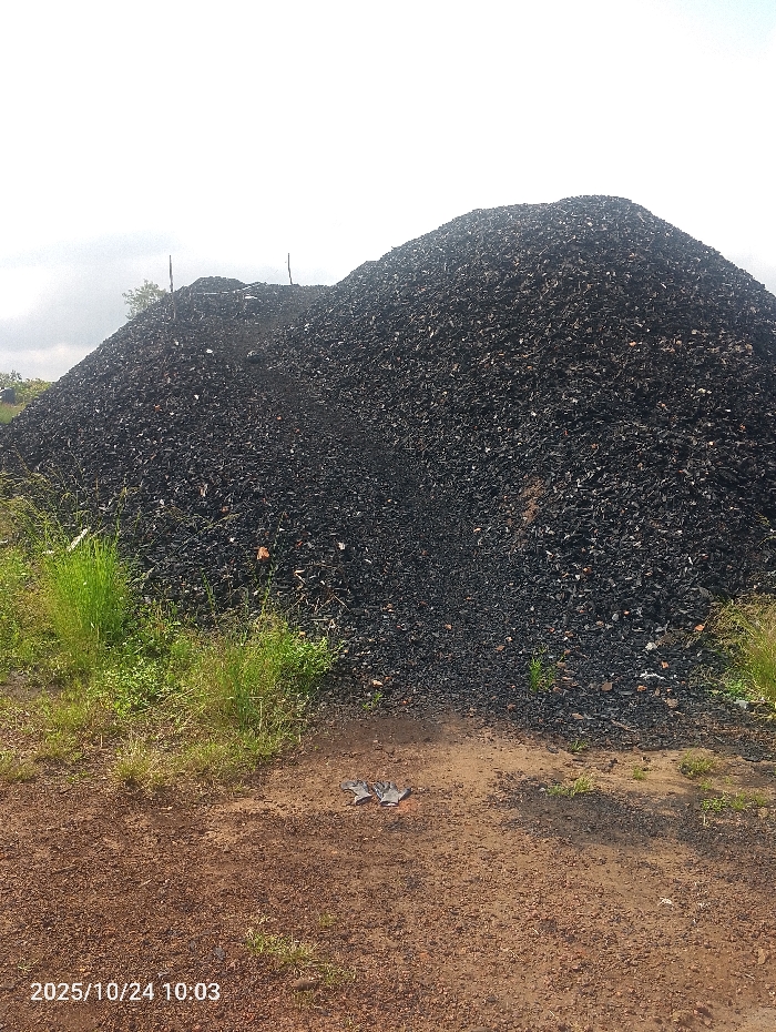 The image displays an outdoor scene in Sanioko, Nigeria, captured at 10:03 on October 24, 2025. A substantial, roughly conical pile of dark, irregularly shaped fragments, consistent with charcoal or industrial slag, dominates the midground and background. The foreground consists of reddish-brown earth sparsely covered with tufts of green grass and small weeds. A pair of light-colored, soiled work gloves is positioned flat on the ground in the lower-center foreground. The sky above is overcast, and minimal distant vegetation is visible on the left side of the frame, behind the main pile. No individuals are present, and no discernible activity is occurring.