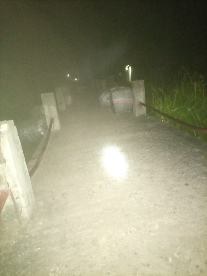 The scene depicts a concrete pathway or road at night in Unknown, Unknown, characterized by low light and limited visibility. A bright, localized light source, likely from a flashlight, illuminates the immediate path surface in the foreground. Along both sides of the pathway, uniformly spaced light-colored rectangular concrete posts are present, connected by dark horizontal railings. To the right of the pathway, beyond the railing, tall green vegetation is visible. Further along the path, multiple large, cylindrical objects, wrapped in plastic sheeting, are visible on both sides. One such object on the right features a reddish-pink band or tape with partial legible text, appearing to be "IN F." Faint artificial light sources are discernible in the distant background. No individuals are present in the image.