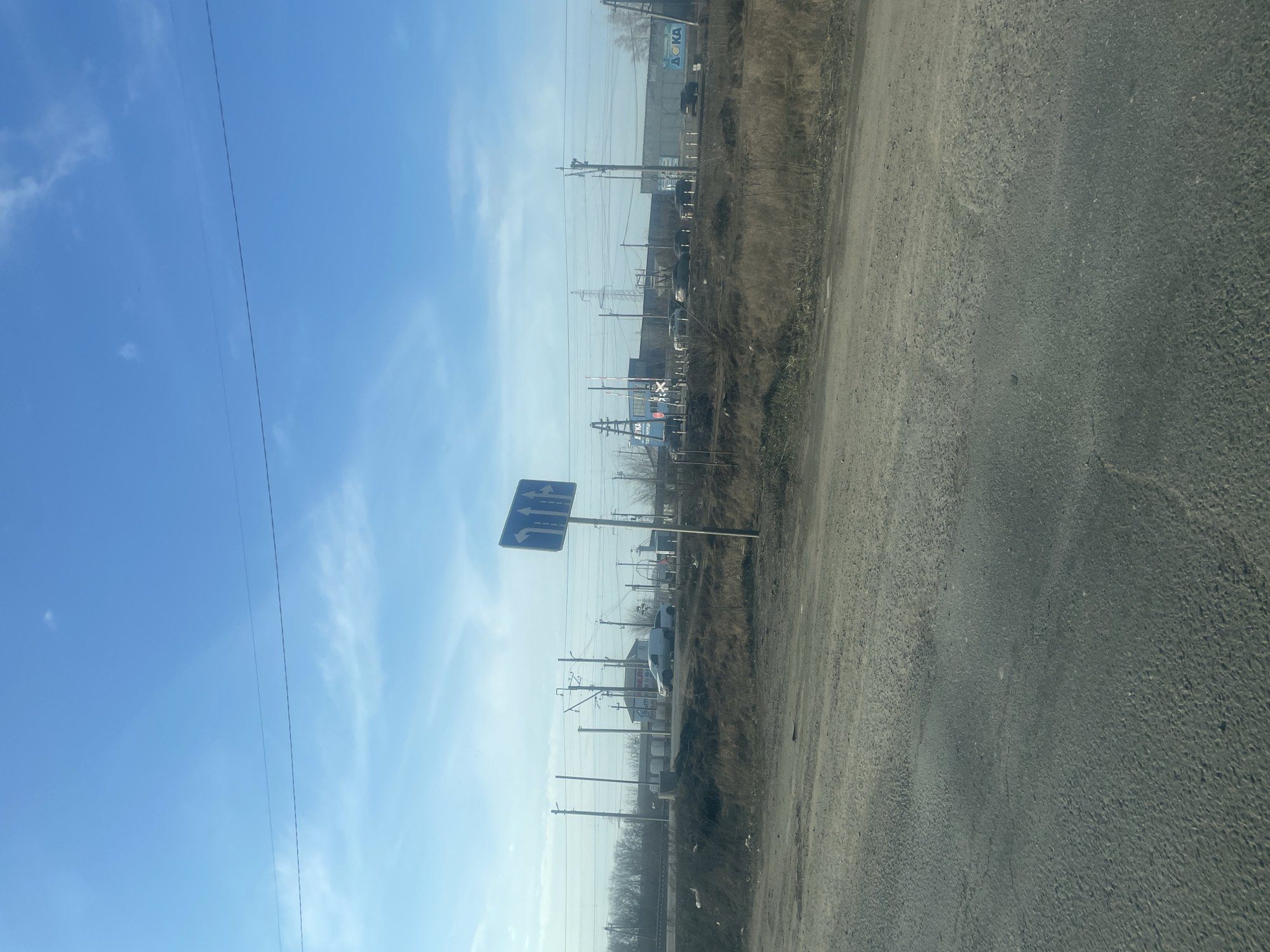 The image depicts an industrial or semi-urban landscape in Tolyatti, Russia, under a clear to partly cloudy blue sky. The foreground consists of a dry, textured, gray road surface. Separating this from the middle ground is a strip of unkempt earth with sparse, brown vegetation. In the midground, a blue rectangular traffic sign on a pole, featuring white arrows indicating "straight ahead" and "right turn," is centrally positioned. Behind this, a railway line with tracks, overhead electrical lines, and numerous utility poles extends horizontally across the scene. Parallel to the railway, a road shows several parked or slow-moving vehicles, including a white van and multiple dark-colored sedans. A railway crossing gate is visible to the left of these vehicles. Various concrete structures and what appears to be a small building or station are also present adjacent to the tracks. The background reveals additional industrial buildings and structures. A large blue sign with the Cyrillic letters "ДОКА" in white is visible on the far right. A bare treeline is present on the far left, and a tall electrical transmission tower stands in the distant right-center. No individuals are discernibly visible.