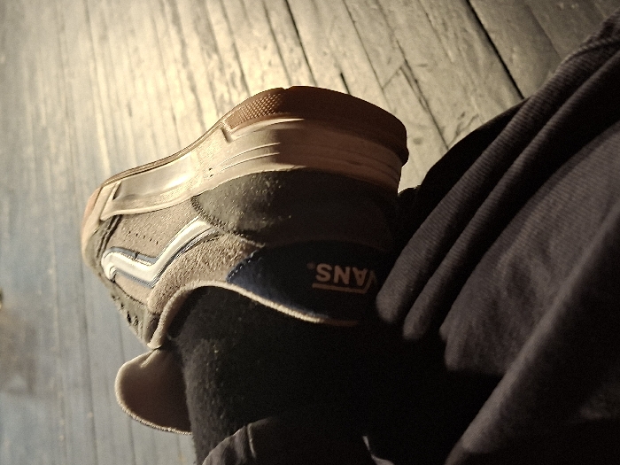 A close-up, low-angle shot depicts an individual's left foot elevated. The foot is wearing a worn grey and tan Vans brand sneaker, with the "VANS" logo clearly visible in white on a dark blue/black panel at the heel. A dark sock is visible above the shoe, leading to dark, creased fabric trousers or sweatpants. The background consists of a weathered wooden floor or decking composed of light brown planks with distinct gaps. The environment is dimly illuminated by a warm light source. No identifying architectural or geographical features are present to confirm a specific location within Sofia, Bulgaria.