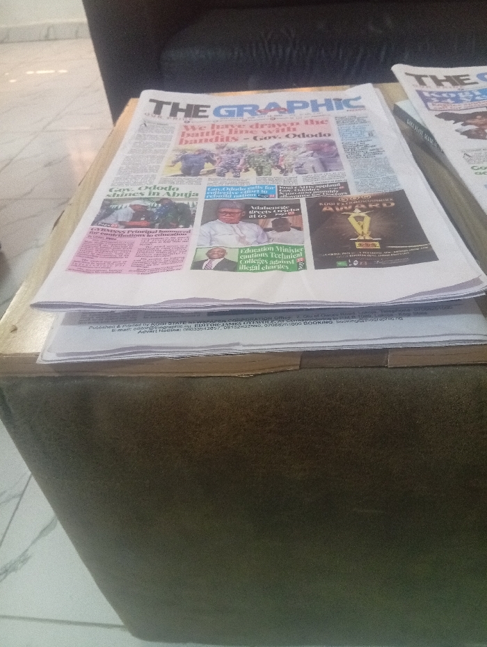 The image depicts a stack of newspapers situated on a light-colored, possibly wooden or laminate, table surface within an indoor environment in Okengwe - Obehira, Nigeria