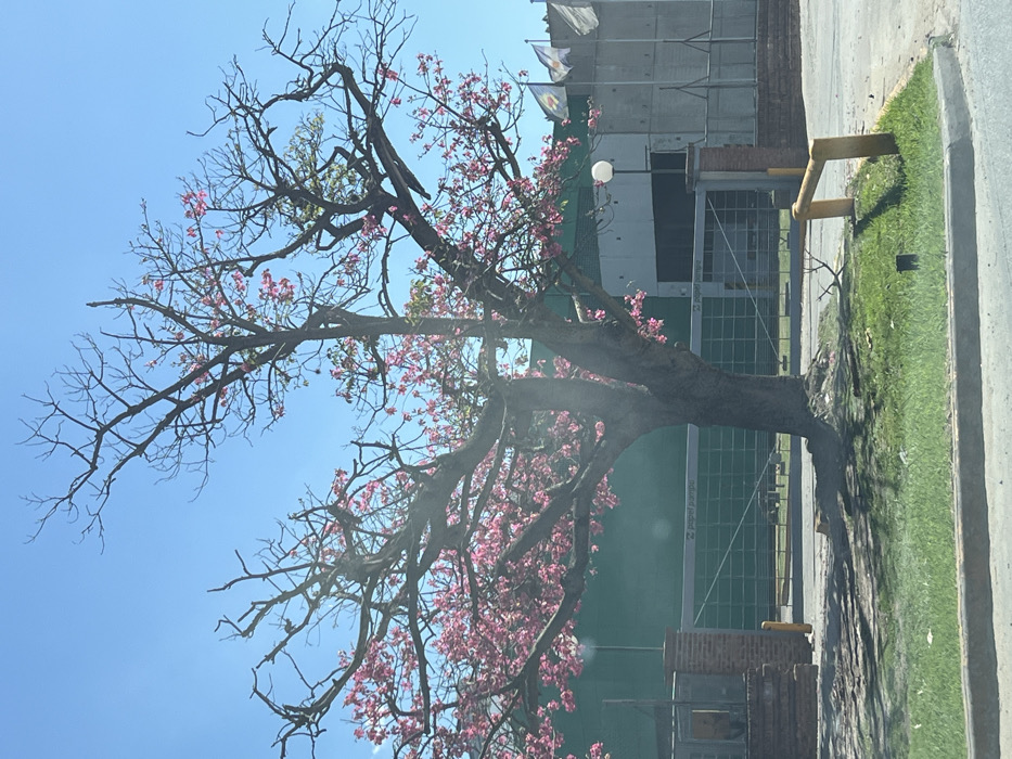 The scene depicts an industrial property entrance under a clear blue sky in the Partido de Quilmes, Argentina. A large, mature deciduous tree, exhibiting a thick trunk and widespread branches, is centrally positioned, bearing numerous clusters of vibrant pink flowers and some green foliage. Exposed roots are visible at its base in the dry ground, adjacent to a strip of green grass and a grey concrete curb. A yellow L-shaped metal barrier is present on the dark paved surface to the immediate right of the tree. Behind the tree, a green metal fence or gate with the inscription "Papel Pampa" is visible, spanning between two brick pillars that form an entranceway. Beyond this gate, a large industrial building complex is discernible, featuring a prominent dark greenish-grey facade and a lighter grey section with vertical elements on the right. A white spherical street light on a dark pole stands to the right of the entrance. In the far right background, three flagpoles display two visible flags, one featuring light blue and white stripes. No individuals or vehicles are present in the observable area.