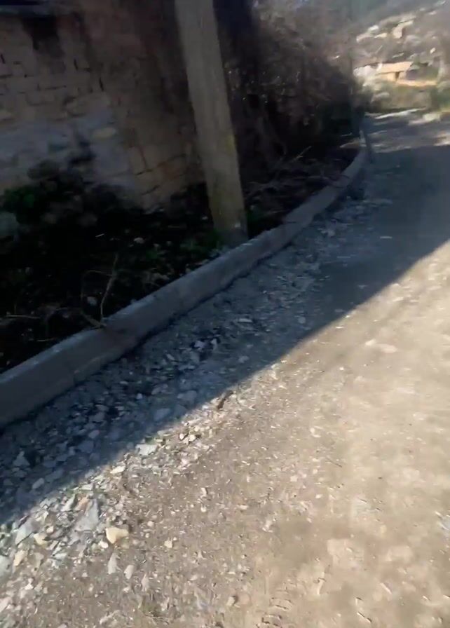 A young woman in a pink and black jacket is walking a brown dog on a lime green leash up a gravelly street. The sun is shining brightly, casting long shadows of the woman and the dog. The street is bordered by low concrete walls on both sides. In the background, a glimpse of a building is visible under a clear blue sky. The camera is pointed downwards, capturing the woman's face, torso, the dog, and the street.