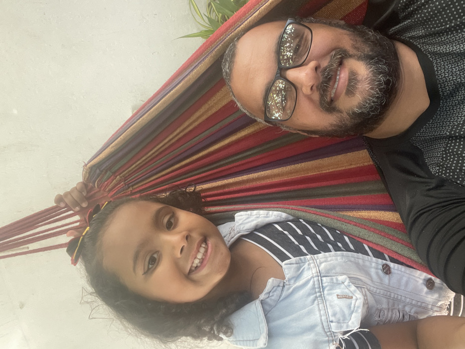 - "This image captures a close-up, informal portrait of an adult male and a young girl, both smiling directly at the camera, situated in a colorful hammock against a light-colored wall" by FM-Bmkwx1, licensed under CC BY 4.0