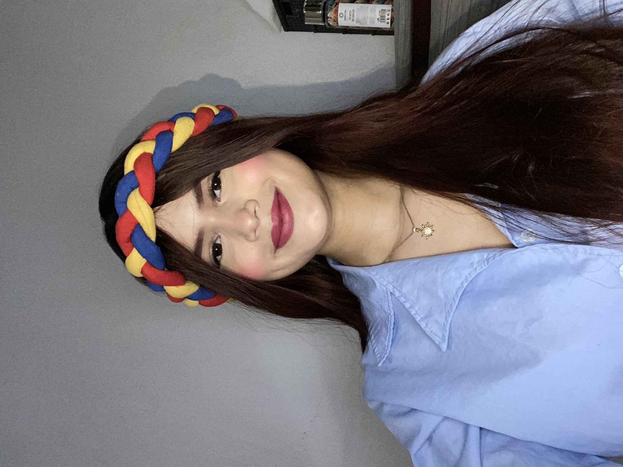 A young woman with long, dark hair, a light blue collared shirt, and a colorful braided headband smiles at the camera. The headband features red, yellow, and blue braids. She wears a necklace with a gold-colored pendant. The background appears to be a room with a gray wall. A shelf with items on it is partially visible in the upper background. There is no concrete evidence in the image to definitively confirm the location as Juan Griego, Venezuela.