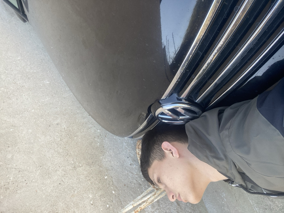 The scene, located in Simeonovgrad, Bulgaria, depicts a young male positioned against the front of a black Volkswagen vehicle under bright daylight conditions. The male, with short dark hair, is wearing a two-toned jacket, possibly olive green and dark blue. He is leaning the back of his head against the car's front grille, specifically near the central Volkswagen emblem, which is silver-toned and prominent. The car's hood is visible above the grille, exhibiting a dark, reflective surface with some minor dust or surface marks. To the left of the male's head, the ground features rusty, elongated metal objects. The background consists of a textured, light-colored concrete surface, indicating an outdoor, urban, or semi-urban environment. The male's gaze is directed upwards and slightly to his left.