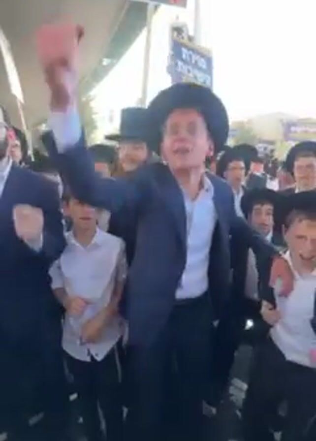 group of Jewish men and boys marching in what appears to be a protest. Most are wearing traditional Hasidic clothing, including black hats and suits. A few of the marchers are holding signs with Hebrew writing. Some of the marchers are cheering and raising their hands in the air. They appear excited and passionate about their cause. The location seems to be outdoors, possibly on a street or underpass. The overall impression is one of collective action and religious identity.