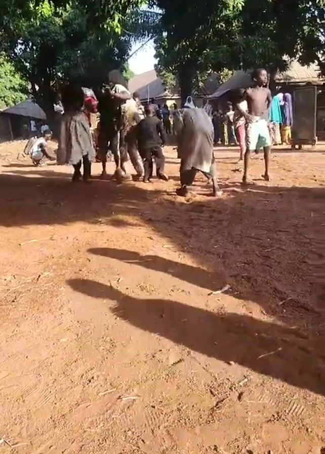 group of people gathered in a dirt clearing, some of whom are dancing to drumming music