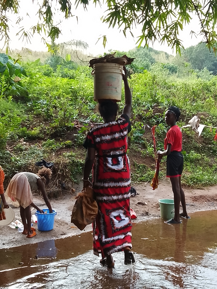Three people are near water, likely washing clothes. One woman in a red and white patterned dress walks toward the viewer, a bucket balanced on her head, holding a bag. To her right, a younger woman in a red shirt and black shorts stands with a cloth in her hands. Another woman is bent over a blue bucket. The setting is a lush, green area with water flowing through it. Clothes are draped over a nearby line.