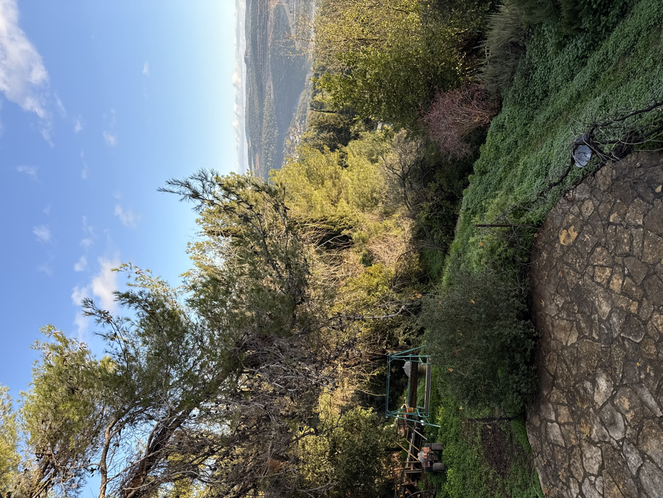 A tilted shot showcases a landscape with a vibrant blue sky and scattered clouds overhead. Verdant trees fill the frame, reaching towards the sky. A distant valley is visible, adding depth to the scenery. On the right, a stone-paved area contrasts with the lush greenery. In the mid-ground, a swing set appears nestled among the trees, partially hidden. The interplay of natural elements creates a serene, outdoors scene.