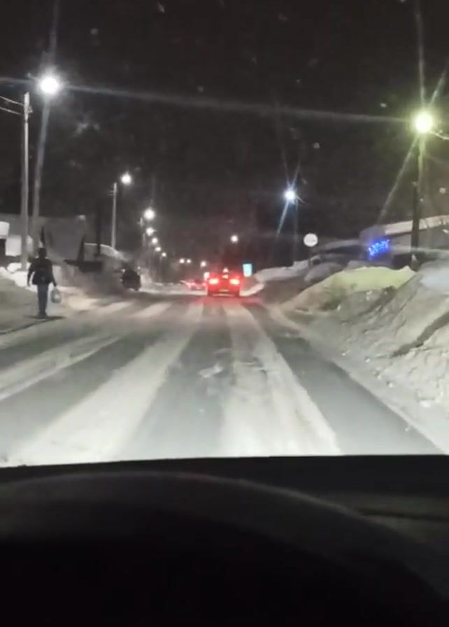A car is driving at night on a snowy road. Streetlights illuminate the road, and there are snowbanks on either side. A person is walking on the left side of the road, and a car is ahead. The dashboard of the car shows the time is 19:27 and the temperature is -60 degrees. Music is playing.