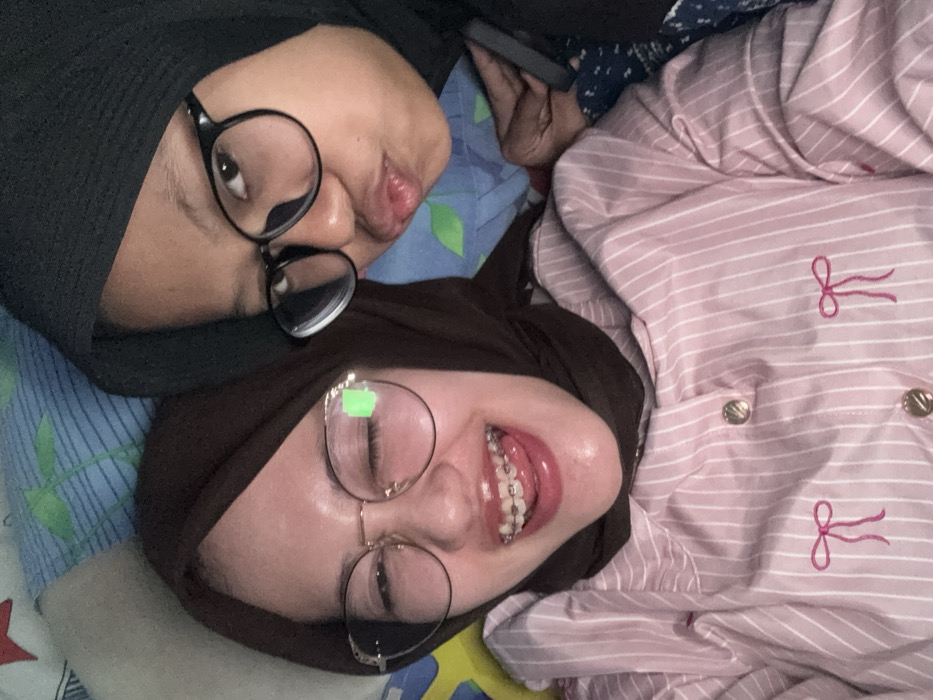 Two young females are depicted in a close-up indoor photograph, located in Kebonsari, Indonesia