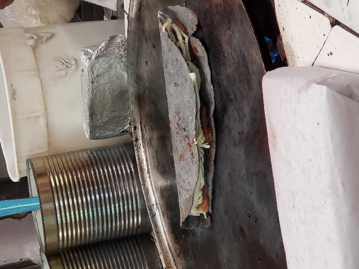 A quesadilla rests on a hot griddle, filled with shredded cabbage and meat. A stack of cylindrical cans sits below, with a turquoise handle sticking out. Aluminum foil-wrapped food sits nearby. Blue flames emanate from beneath the griddle, cooking the quesadilla. The griddle appears worn, with noticeable signs of use. A white container and piece of paper are also in view.
