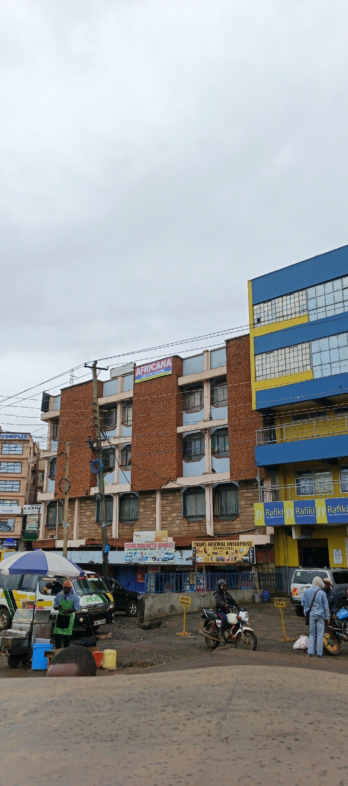An urban scene depicts a street with multiple buildings. A brick building with an "Africana Driving School" sign stands next to a blue and yellow building with "Rafiki" signs. Street vendors and motorcycles are present in the foreground. The sky is overcast. Several signs, including "Trans-Neutral Enterprise," are visible on the buildings. A variety of vehicles and pedestrians are scattered along the street, indicating a bustling environment.