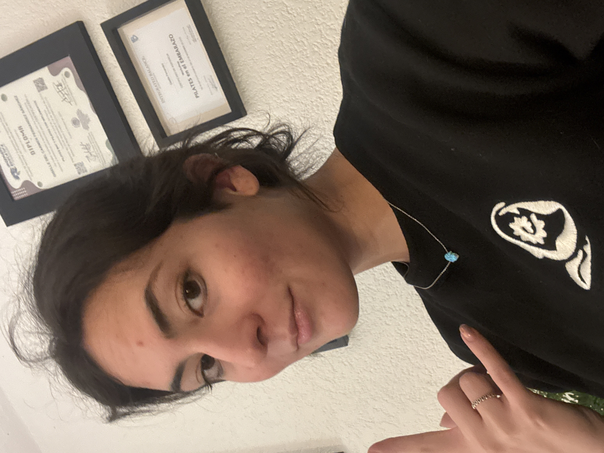 A young woman is photographed indoors, presumably in Puebla, Mexico, given the "DIPLOMA" certificate visible in the background, written in Spanish. She is wearing a black shirt and a silver necklace with a blue pendant. Her dark hair is pulled back. She has light skin and minimal makeup. Her right hand is visible, adorned with a delicate silver ring, and her index finger is extended. Two framed certificates hang on the wall behind her, one stating "PILATES EN EL EMBARAZO," which translates to "Pilates in Pregnancy."