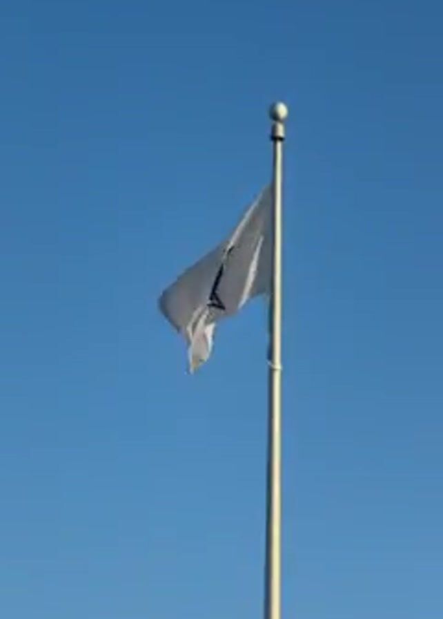 Dallas Cowboys flag waving in the wind against a clear blue sky. The flag is white with a navy blue star in the center. It is attached to a tall, silver flagpole topped with a spherical finial. The camera angle is low, looking up at the flag.