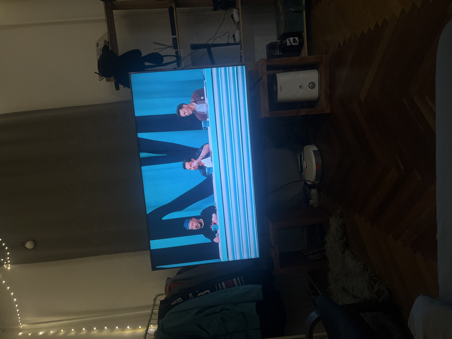 A television displays a program with three men in front of a turquoise background. A white robot vacuum sits nearby. The room includes wood floors, a shelving unit with items on display, a small decorative tree, and a gray wall adorned with string lights. Clothing hangs over a rack in the foreground.