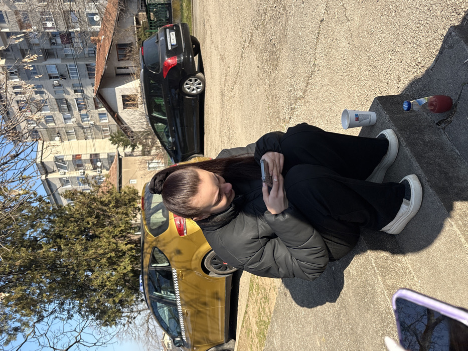 The image depicts an outdoor scene in Cherven Bryag, Bulgaria, on a clear, sunny day. A female individual is foregrounded, crouched on concrete steps, wearing a black puffer jacket, black pants, and white platform sneakers. Her dark brown hair is pulled back into a high ponytail. She is actively engaged with a light-colored smartphone held in both hands, looking down at the screen. To her right, on the same step, rests a white paper cup, and on a lower step, a small glass bottle containing a red liquid. A corner of another smartphone with a light purple case is visible in the bottom left. In the mid-ground, a gold-colored hatchback or mini-MPV, marked with a checkered taxi stripe along its side and a blue taxi sign on its roof, is parked on the left. Further to the right, a black Peugeot 308 SW station wagon with a Bulgarian license plate (BH 6XXX MM) is parked on a dirt lot. The background features a mix of urban architecture, including a residential house with a red-tiled roof behind the black car, and several large, multi-story apartment buildings with numerous windows, balconies, and air conditioning units. Sparse winter trees and a tall evergreen tree are also visible under a clear blue sky.