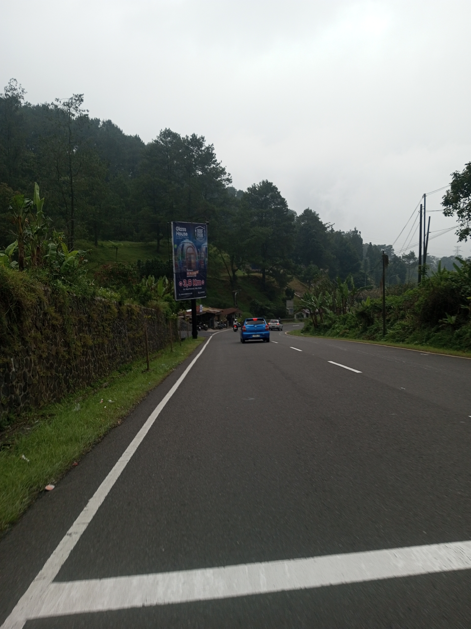 road in a mountainous area, possibly in Mae Chan District, Thailand, although without further information, it is impossible to say with certainty. The road is paved and has white lines marking the lanes. A blue car is driving on the road, with another car further ahead. There is a large billboard on the left side of the road, advertising "Glass House Roof Park" along the side of a stone wall, and behind it are trees and greenery. The sky is overcast and gray. Power lines are visible on the right side of the road, surrounded by dense vegetation.