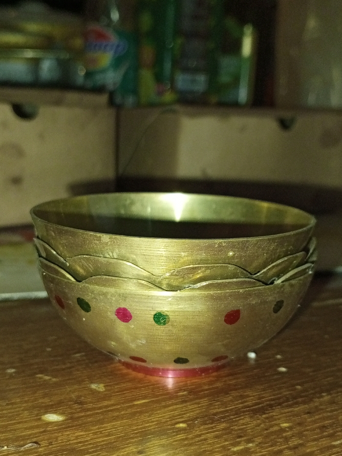 - "A stack of three brass-colored metal bowls rests on a worn wooden surface in Longmiang, Laos" by FM-sU0PJ2, licensed under CC BY 4.0