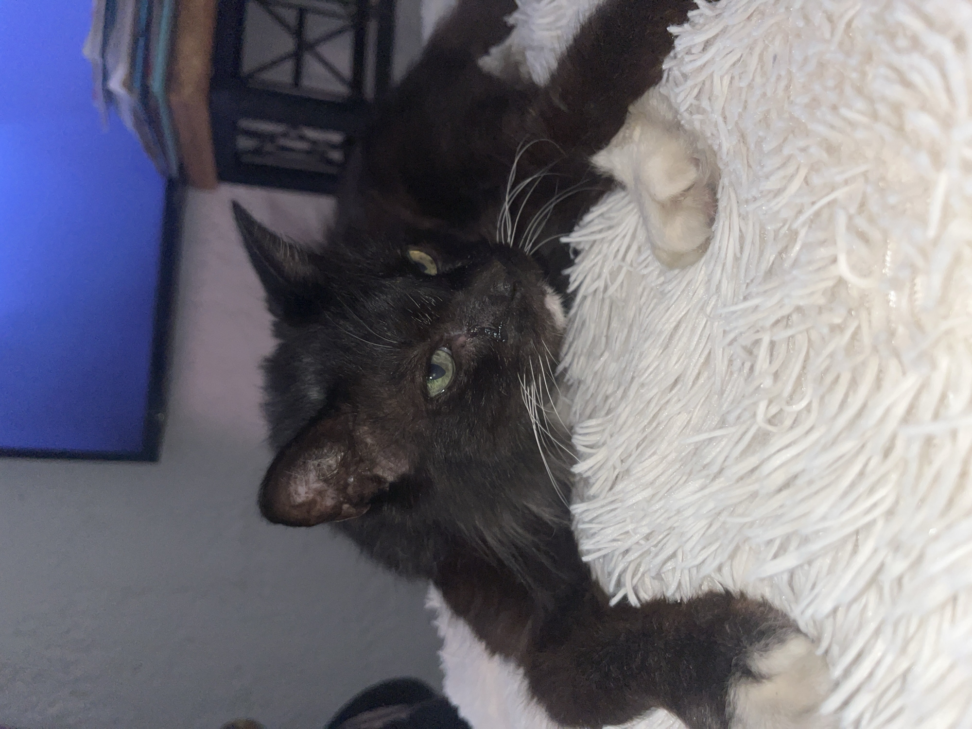 A black cat with green eyes rests on a white, shaggy cushion. The cat is positioned with its head turned towards the camera and its paws outstretched. In the background, a blue screen is visible, along with a black wire rack. The location is unknown.