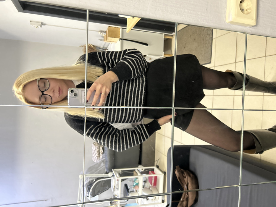 The image depicts a blonde female taking a mirror selfie indoors in Voskresensk, Russia. The subject, visible from head to upper shin, wears dark-framed eyeglasses, a black and white horizontally striped sweater over a white collar, a black skirt, black sheer tights, and dark knee-high boots. She holds a light-colored smartphone with her left hand, displaying dark nail polish, while her right hand is partially obscured, resting in her skirt pocket. The mirrored reflection reveals a room with light gray walls and light-colored tiled flooring. To the subject's left, a dark-colored sofa with a brown bag rests adjacent to a white multi-tiered rolling utility cart containing various small items. To the subject's right, a white cabinet with a wooden top and decorative elements is visible, along with a dark door frame and a light-colored electrical outlet mounted on the wall.