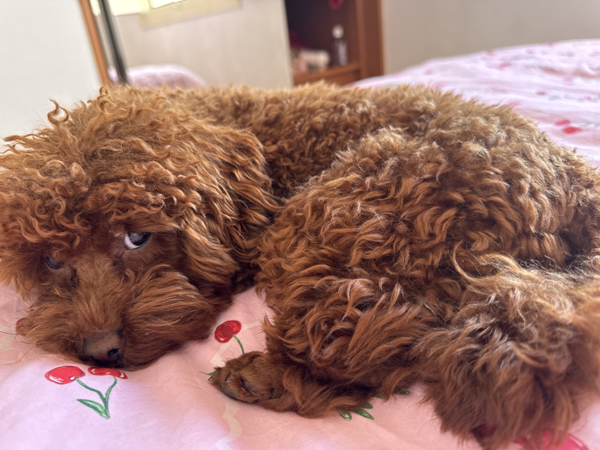 A reddish-brown toy poodle, exhibiting dense, curly fur, lies curled on a pink bedsheet patterned with red cherries and green stems