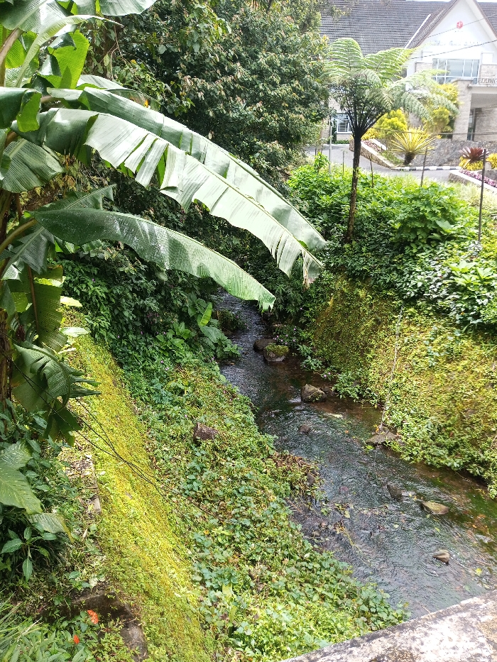 The image displays a verdant outdoor scene within the city of Bijanwada, India. A narrow stream, containing several visible rocks, flows from the background towards the foreground. Both banks of the stream are densely covered with various green foliage, moss, and small plants. Large, partially damaged banana leaves extend into the frame from the left foreground. On the right bank, a distinctive fern-like tree stands amidst the greenery. In the background, beyond the dense vegetation, a multi-story building with white walls and a grey gabled roof is visible. A prominent red cross symbol is displayed on the building's facade, indicating it is likely a medical or humanitarian facility. Partial text, possibly "DUNG...", is visible on the building. The building is surrounded by landscaped grounds with paved sections. No people or animals are present. The viewpoint is elevated, looking down into the stream, with a concrete edge visible in the lower right foreground.