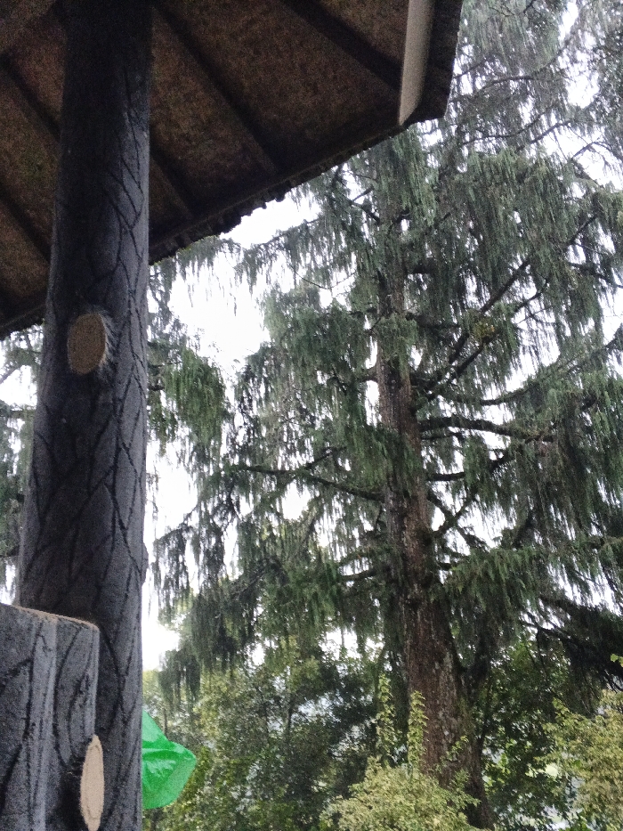 A low-angle shot shows a structure with a thatched roof supported by a textured, dark grey column. Behind the structure, a tall evergreen tree with drooping branches dominates the scene. Other lush greenery fills the lower portion of the frame. The sky is overcast, casting a soft, diffused light on the landscape. The scene evokes a sense of being within a shaded, natural setting.