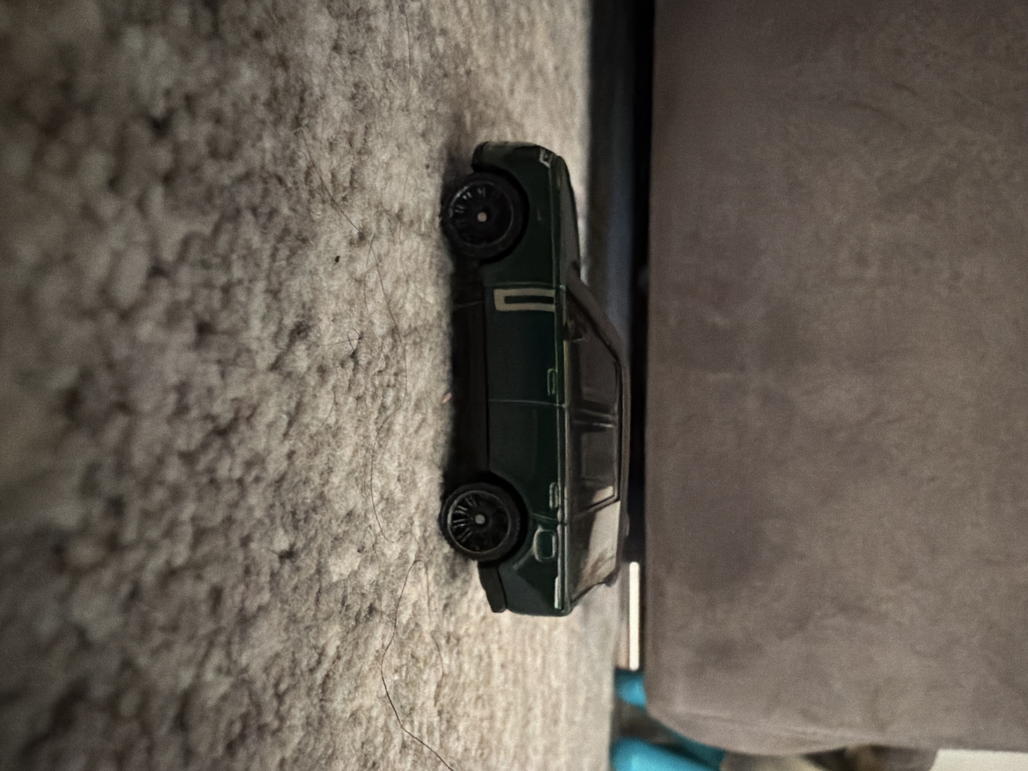A dark green die-cast model car sits on a grey carpet next to a grey couch