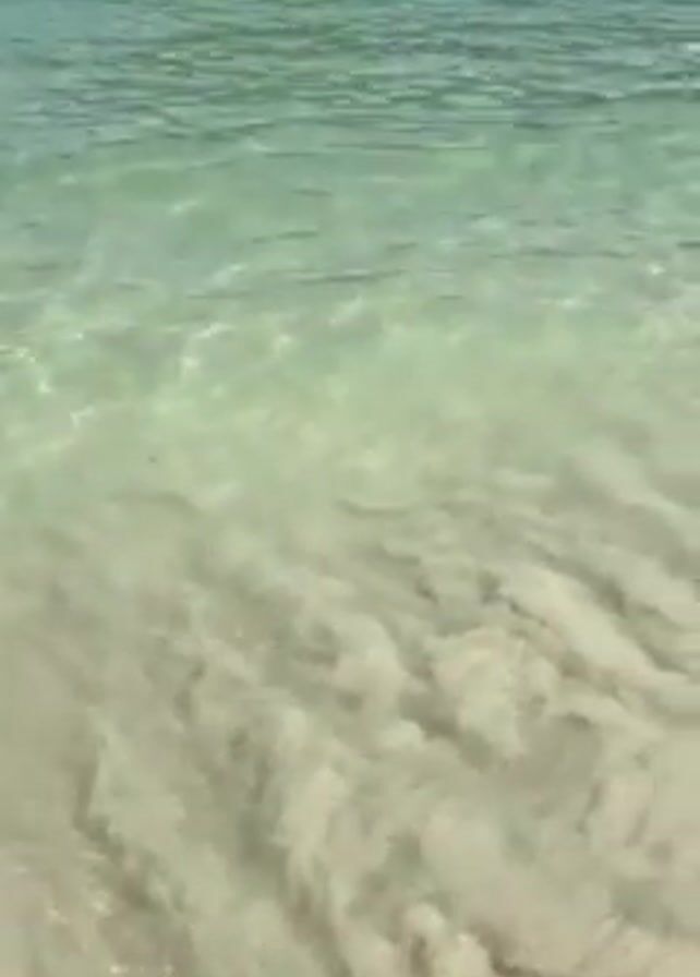 The video begins with a view of the sandy bottom of a shallow, clear ocean