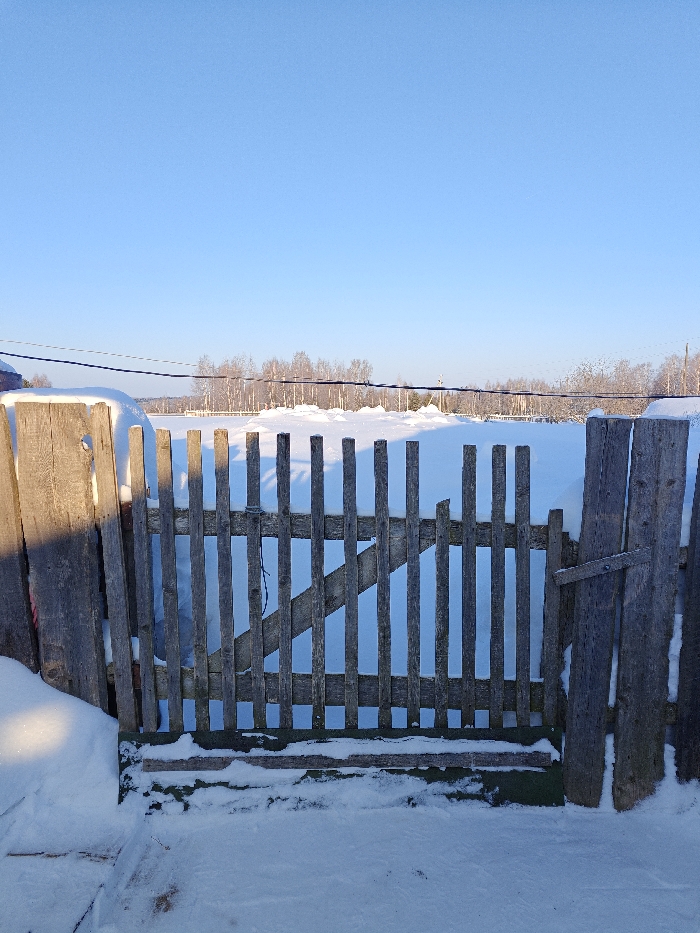 This image depicts a winter scene in Nizhnyaya Gar', Russia, under a clear, bright blue sky. The foreground features a weathered, unpainted wooden picket fence, partially obscured by snowdrifts. The fence consists of vertical slats, some with minor damage, secured to horizontal cross members. A section of the fence to the left appears to be a gate, attached to a sturdy vertical post with a visible hinge. Deep snow covers the ground in front of and behind the fence, with the fence structure itself casting distinct shadows on the snow-covered field beyond. In the midground, a vast, unbroken expanse of snow extends towards the horizon. A line of bare deciduous trees stands in the far background, silhouetted against the bright sky, with a few power lines visible horizontally across the scene. A light-colored structure, possibly a building, is partially visible on the far left edge of the frame, also covered in snow. No individuals or active subjects are present.