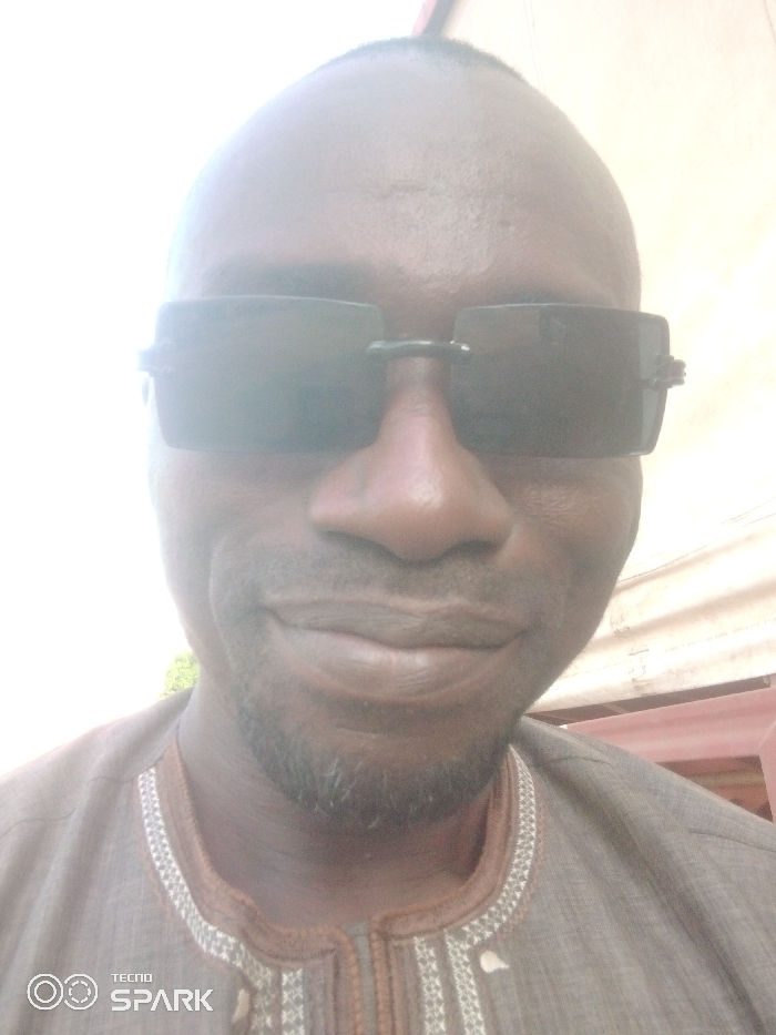 A close-up portrait of a dark-skinned man with a shaved head is captured. He sports dark, rectangular sunglasses, obscuring his eyes. His expression is subtle with a slight smile. The man wears a brown shirt with a patterned neckline. The lower-left corner features a "Tecno Spark" logo, indicating the device used for the photo. The background is blurred, suggesting focus on the subject's face.
