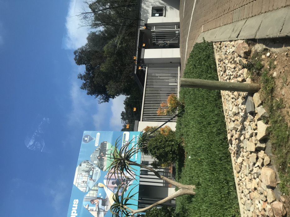 A view of a building behind green foliage and a tall advertisement for a campus or educational institution. The building has a grey gate, white walls, and an electric fence on top. To the right of the building is a grey stone wall and a grass mound. The advertisement shows images of students at a campus or school and has the word “Campus” written across the bottom. The sky is a clear blue with scattered clouds.