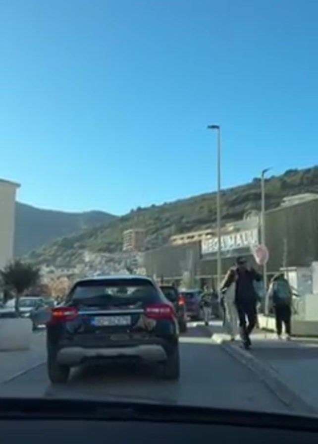 The video, taken from inside a car stopped in traffic, shows a busy street scene on a bright, clear day