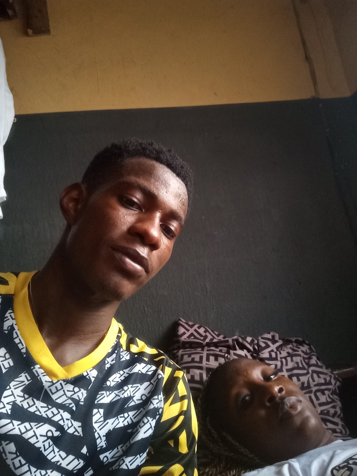 A selfie captures two individuals in a dimly lit indoor space. A man, dressed in a black and yellow patterned shirt, dominates the foreground with a slightly tilted head and a focused expression. Beside him, a woman reclines on a pillow featuring a geometric design. She gazes upward with a serene look. The background consists of a dark wall, with a lighter colored area above it, possibly indicating the ceiling or another wall. A small white object is visible in the upper left corner.