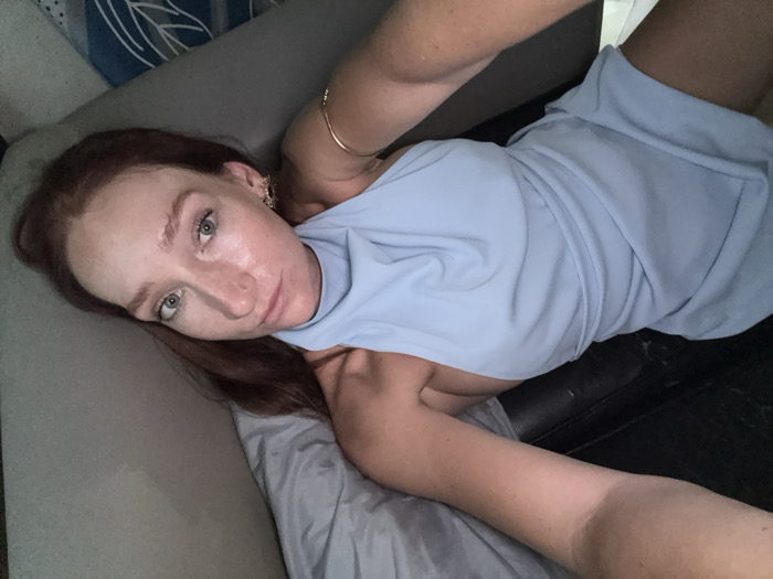 A single individual, an adult female with fair skin, reddish-brown hair, and green eyes, is depicted in an indoor setting. She has apparent freckles on her face and light-colored eyebrows. She is wearing a light blue, high-necked, short-sleeved or sleeveless garment, likely a dress. A gold-colored hoop earring is visible in her right ear, and a gold-colored bracelet is on her left wrist. She is positioned lying down, with her head resting on a grey cushioned surface, possibly a sofa or bed. Her body extends onto a darker, possibly black, surface. She is looking directly towards the camera. In the background, to the upper left, a blue and white patterned object, resembling a cushion or textile, is partially visible. The specific location within the city of South Jakarta, Indonesia, cannot be determined from the provided image data.