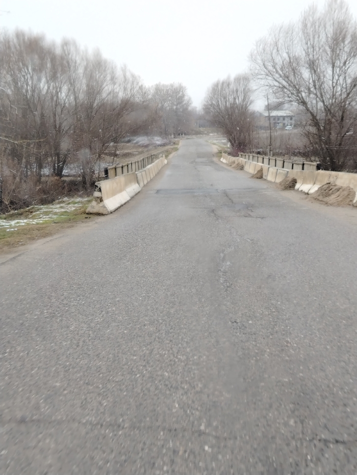 The image depicts an elevated asphalt road or bridge in Beshbola, Uzbekistan, under an overcast sky with light snowfall. The road surface is gray and exhibits multiple cracks and small potholes, extending into the distance where it gently curves right and ascends. Concrete barriers, light in color, line both sides of the road, appearing to form a bridge railing system with integrated dark posts. On the right side, piles of tan sand or dirt are accumulated against the base of these barriers. Beyond the barriers on both sides, the terrain slopes downwards, featuring sparse brown vegetation, patches of green grass, and light dusting of snow on the ground. Numerous bare deciduous trees with dark branches line the road, forming dense clusters. In the mid-ground on the right, partially obscured by trees, stands a light-colored multi-story building. A white vehicle is parked near this building. No individuals or active vehicles are visible on the road or in the immediate vicinity.