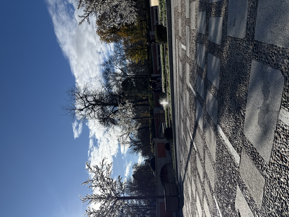 The image presents an outdoor scene within the Jardines de Sabatini (Sabatini Gardens) in Madrid, Spain, under bright daylight. The foreground consists of a pedestrian plaza paved with a geometric pattern of large, light-grey rectangular stone slabs set into a darker, small-pebble mosaic. Distinct, elongated shadows are cast from the left across this paving. In the midground, a low, dark-colored barrier separates the plaza from a landscaped strip containing sparse green groundcover. Within this strip, a small, circular ground-level fountain emits a single vertical stream of water. Behind this, a multi-tiered stone wall structure, incorporating reddish-brown panels and some embedded planters, rises. A cluster of approximately four to five indistinct human figures is visible near the fountain, with one additional figure standing further to the right. The background is characterized by numerous trees, predominantly deciduous with bare branches. Some trees feature dense white, possibly artificial or ornamental, foliage. A segment of trees on the right displays autumn coloration with yellow-orange leaves. The upper portion of the frame shows a bright blue sky with scattered white cumulus clouds.