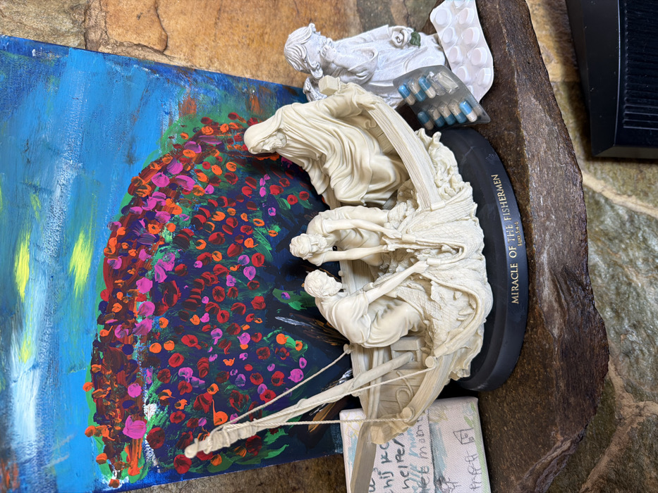 The image, located in The Hague, Netherlands, presents a collection of objects arranged on a rustic, multi-toned stone surface. A central cream-colored religious figurine grouping, titled "MIRACLE OF THE FISHERMEN" (Luke 5:4-6) on its black oval base, depicts four robed figures in a boat. One figure is seated, while two others actively pull a fishing net from the boat, and a fourth figure stands near the bow with a mast. Behind this, a vibrant, abstract painting on canvas, featuring a blue background with a colorful array of red, pink, orange, and yellow dabs representing foliage, leans against a stone wall. To the left of the main figurine, a small, rectangular canvas or stiff paper displays partial handwritten Dutch text, including "Dank u wel helpt u me" and "lieve mama," with a basic house drawing below. To the right, a smaller, light-colored figurine of a robed figure holding a rose is positioned next to a clear blister pack containing ten capsules, five empty and five filled with half-blue, half-white medication. A second, white blister pack lies partially visible beneath this. The entire scene is set against a textured stone wall.