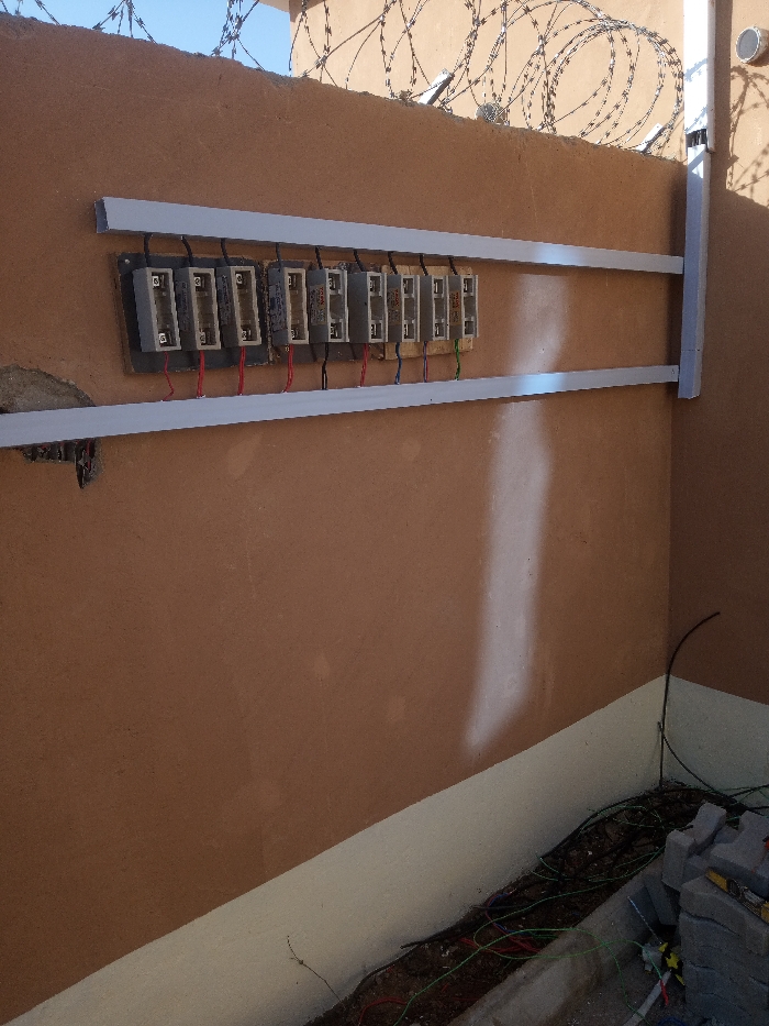 The scene depicts an exterior wall of a structure in Badiko, Nigeria. The wall is painted a reddish-brown color with a lighter, cream-colored base. Mounted horizontally on the wall are two parallel light-grey metallic channels. Between these channels, a series of ten individual electrical fuse boxes or circuit breakers are affixed to a dark wooden or composite board. Each box has wires, predominantly red, black, blue, and green, extending downwards. Above the wall, against a light blue sky, a dense coil of razor wire is visible, securing the top perimeter. To the right, a portion of the wall turns a corner, with a vertical grey metallic channel running up the edge. At the base of the wall, a trench or low-lying area contains loose soil, numerous entangled electrical wires of various colors (green, red, blue, yellow), and a small stack of grey concrete blocks. No individuals are present.