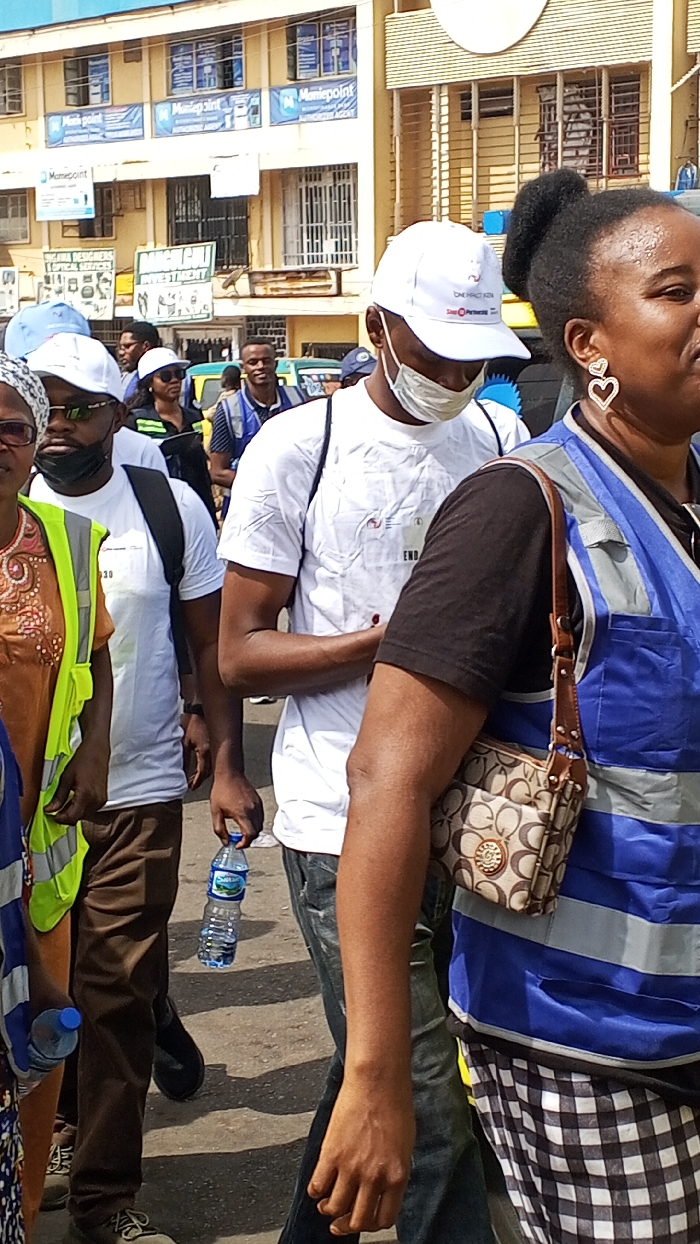 A group of approximately ten individuals is depicted walking outdoors on a paved urban street in Maiburiji, Nigeria, under daylight conditions. In the immediate foreground, to the right, a dark-skinned female, her right side visible, wears a black t-shirt, a blue and grey reflective safety vest, and a black and white checkered lower garment. She has dark hair pulled back and wears heart-shaped white earrings. A patterned light brown shoulder bag with a dark brown strap hangs from her right shoulder. To her left, a dark-skinned male wears a white short-sleeved t-shirt, a white baseball cap featuring "One Impact Agenda" and "Stop P Partnership" branding, a white surgical mask, and dark trousers; he holds a clear plastic water bottle in his right hand. Behind him, partially obscured, another dark-skinned male wears a white t-shirt, dark sunglasses, a black face mask, a black backpack, and brown trousers. To his immediate left, a person with an orange/brown patterned top wears a neon green/yellow reflective safety vest. Multiple other individuals are visible further back, some also wearing reflective vests, suggesting participation in a group activity. The background features two multi-story commercial buildings. The building on the left displays several "Moniepoint Authorized Agent" banners and signs, along with "ORIGINAL DESIGNERS" and "MAIGACHI INVESTMENT" signage at street level. Windows on both buildings are visible, some secured with metal grates. The paved surface beneath the individuals shows shadows consistent with overhead sunlight.