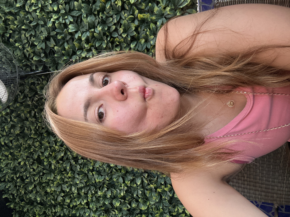 A young woman angles her face toward the camera with pursed lips. Her blonde hair falls around her face and over her pink tank top, where a delicate gold necklace rests. A backdrop of dense green foliage fills the left side of the frame, partially obscured by a black fan on a stand. The woman's skin tone appears fair, with visible pores and slight redness on her cheeks.