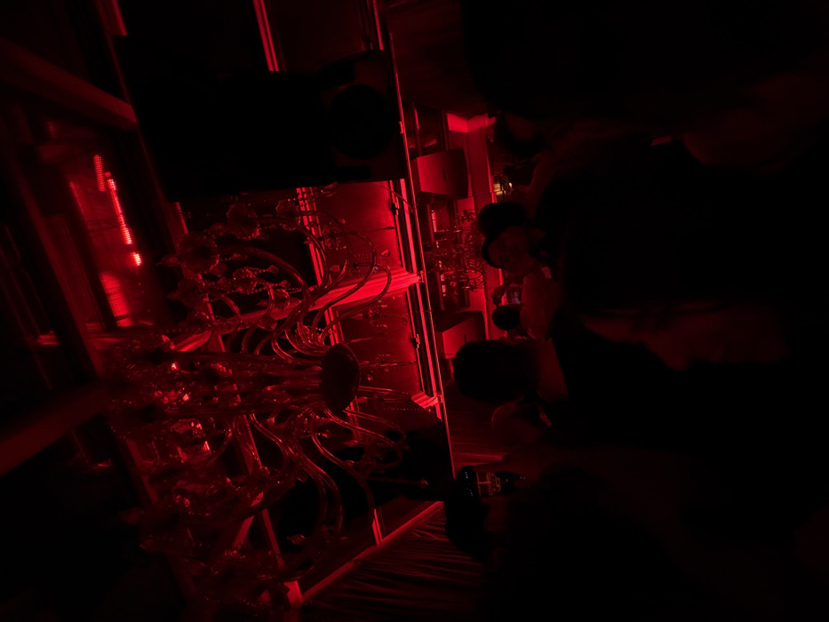 The image depicts an interior scene of a crowded establishment, likely a nightclub or bar, in Mexico City, Mexico. The environment is dominated by intense red ambient lighting, creating deep shadows and silhouettes. A large, multi-tiered crystal chandelier hangs prominently from the ceiling in the upper-left to central portion of the frame, reflecting the crimson illumination. To the upper right, a large, dark-colored speaker cabinet is mounted. Additional linear red light fixtures are visible along the ceiling structure and potentially on walls in the background. The lower half of the frame is occupied by numerous individuals, mostly visible as indistinct, dark silhouettes due to the low light. Their faces and specific attire are largely obscured. No discernible actions or interactions between individuals are clear, but their close proximity suggests a dense gathering. A second, smaller crystal chandelier is faintly visible further in the background, to the right of the main chandelier.