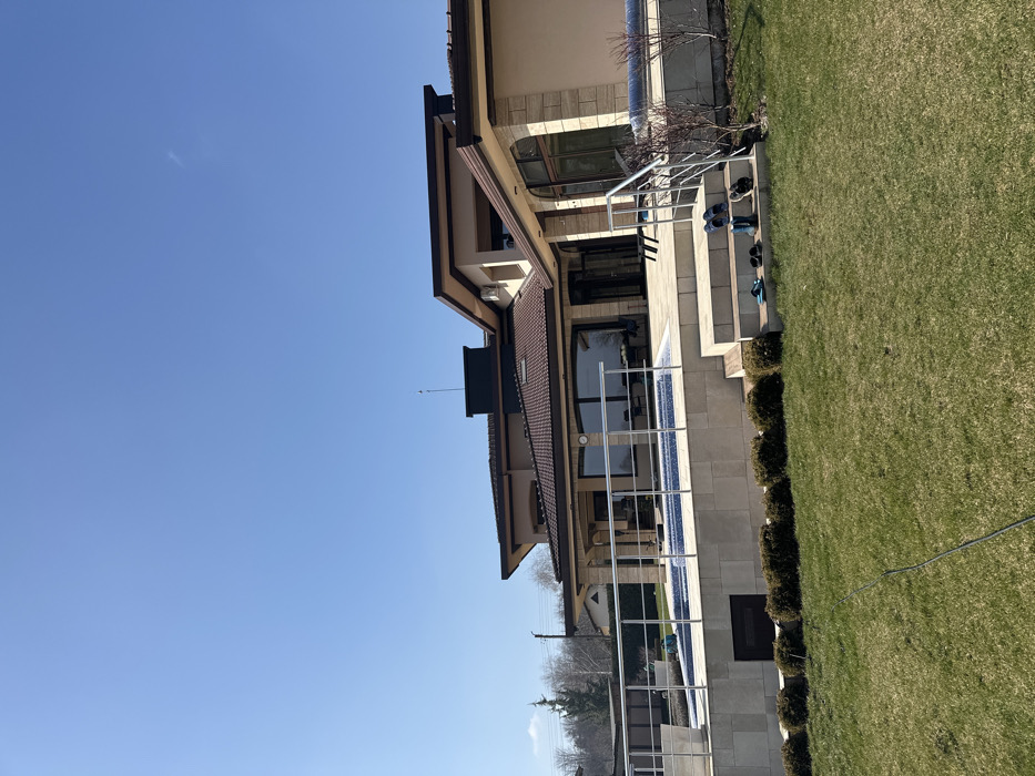 The image displays the exterior of a multi-level residential property in Erden, Bulgaria, under a clear blue sky. The building features light beige walls, a dark brown tiled roof, and extensive glass windows and doors. A black, rectangular structure topped with an antenna is present on the roofline. An outdoor swimming pool with blue mosaic tiling occupies a raised, light-colored tiled patio area, partially enclosed by a stainless steel railing. Steps, appearing to be wood integrated into a stone wall, descend from the patio to a meticulously maintained green lawn. Four pairs of footwear—two pairs of flip-flops, one pair of blue clogs, and one pair of dark shoes—are neatly arranged on the lower steps. A row of low, trimmed evergreen shrubs borders the patio's base. A dark cable or hose lies across the foreground lawn. In the background, dormant deciduous trees and glimpses of other residential structures, alongside utility poles and lines, are visible. No individuals are present in the scene.