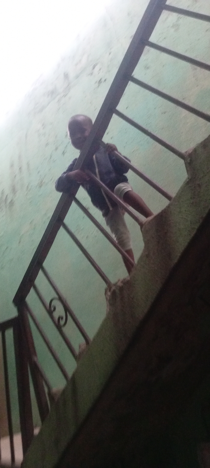 A child stands on a set of stairs, leaning against the metal railing. The child wears a dark shirt and light shorts. The staircase is old and worn, with peeling paint on the wall behind it. The lighting is poor. The railing is simple with a single decorative swirl. The angle of the shot is tilted, making the stairs appear to ascend sharply.