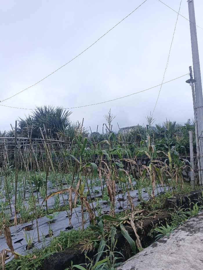 A field of corn plants stretches across the foreground, interspersed with rows of other crops covered in black plastic sheeting. Tall, slender bamboo poles stand among the plants, supporting unseen vegetation. Beyond the cultivated area, lush greenery ascends towards a misty, overcast sky. A concrete utility pole with a streetlight is visible on the right edge, and power lines run across the upper portion of the frame. A narrow, paved path borders the field.