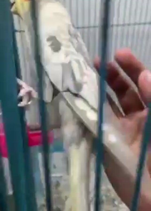 - "A person’s hand is touching the outside of a blue cage with a white and gray cockatiel with a yellow head inside" by FM-BeFBg1, licensed under CC BY 4.0